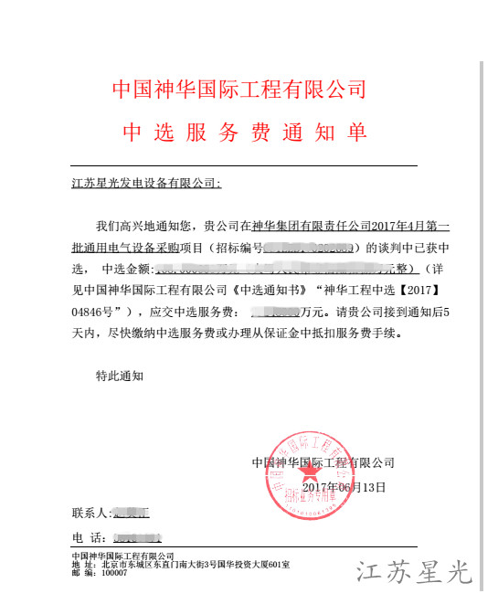中国神华国际工程有限公司发电机组采购中标通知书